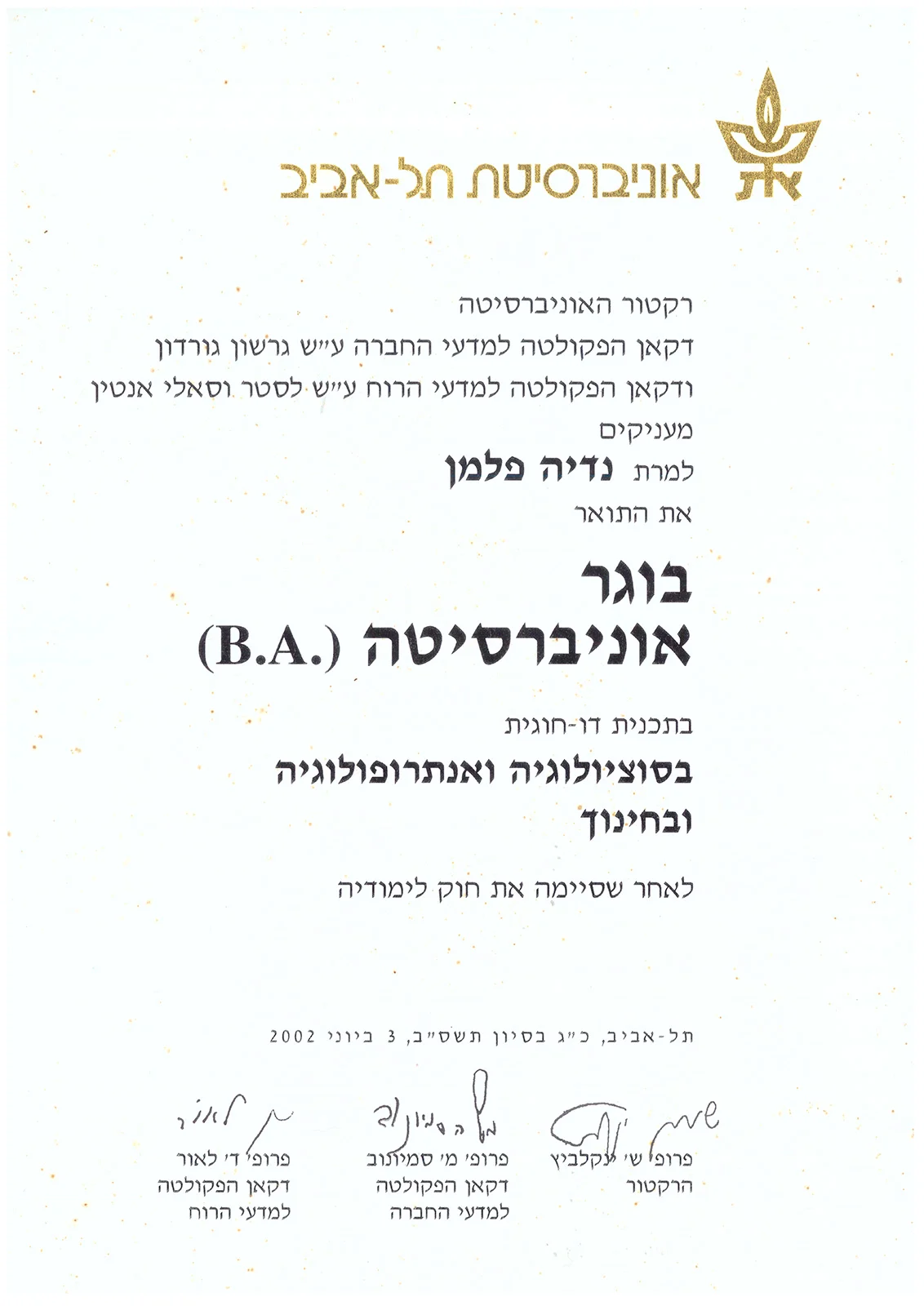 Первая степень (BA) по социологии и антропологии и педагогике — Tel Aviv University, Израиль, 1997−2001